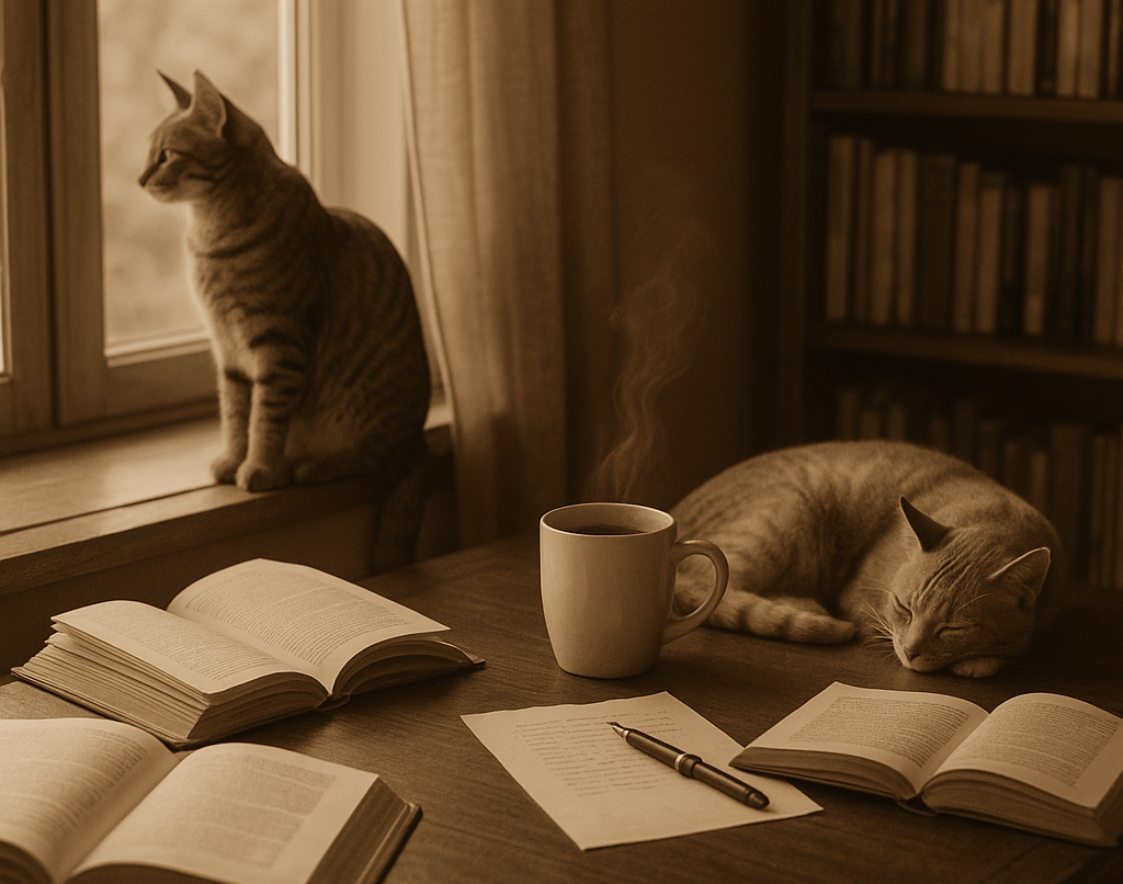 Und dann sind da noch fünf Katzen, die sich irgendwo zwischen Freiheit und Futterzeit wie selbstverständlich in mein Leben geschlichen haben. Sie sind neugierige Mitbewohner, pelzige Kritiker und gelegentlich auch Saboteure, wenn sie sich mit Vorliebe auf die Tastatur legen, sobald ein Satz gerade zu fließen beginnt.